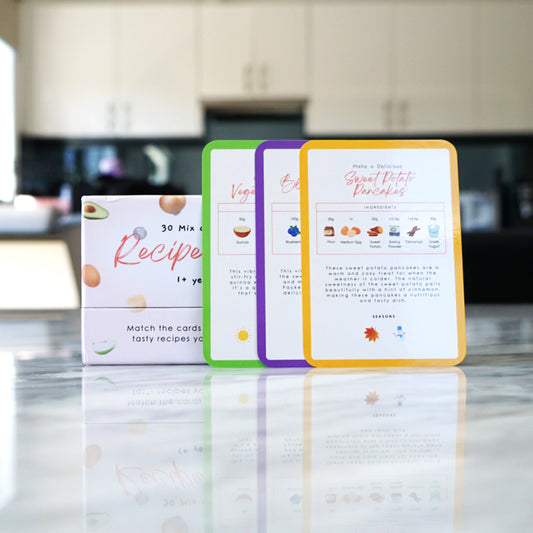 30 Mix and Match Recipe Cards to remove the stress from mealtime and turn it into a fun-filled experience. Gamify meal prep ensuring your child enjoys healthy, balanced and seasonal meals.